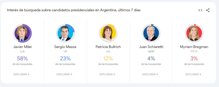 De acuerdo a los datos obtenidos, el candidato a presidente de La Libertad Avanza, Javier Milei, lidera con un 54% las búsquedas sobre los presidenciables en Google. Tras él, se encuentran Sergio Massa, del oficialismo, con un 26%, y Patricia Bullrich, con un 12%. Juan Schiaretti ocupa el cuarto lugar con un 4% y Myriam Bregman está en último lugar con un 3% de las búsquedas.