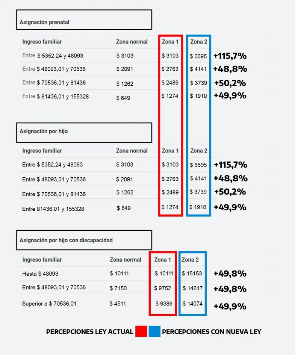 La inclusión de la provincia de Río Negro dentro de la Zona 2 de cobro de asignaciones familiares tiene consecuencias concretas. Así, en la Resolución ANSES N°75/2020 se estableció el nuevo esquema de pago de asignaciones a partir de marzo de 2020. Las diferencias dinerarias entre la Zona 1 y la Zona 2 se pueden visualizar en los montos establecidos para el pago de las asignaciones prenatal, por hijo, por hijo con discapacidad, de ayuda escolar anual y de ayuda escolar anual para hijo con discapacidad. (Fuente: Prensa Martín Soria)