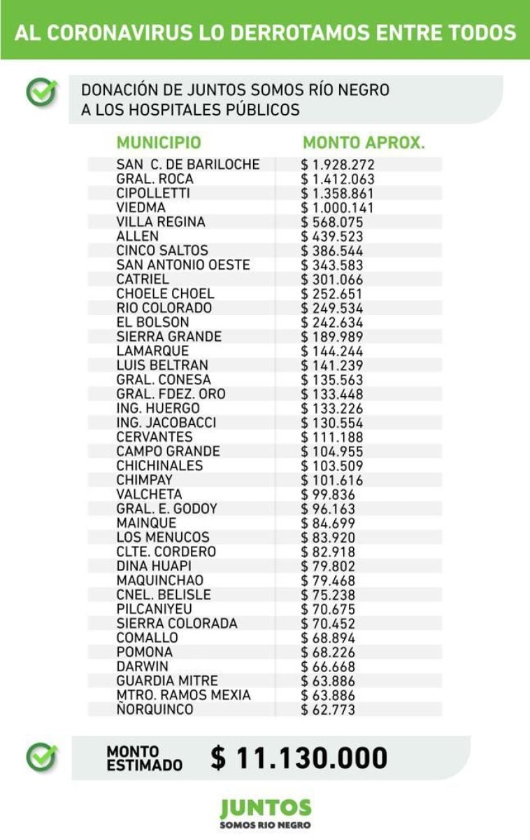 A través de un fondo solidario, el partido provincial Juntos Somos Río Negro aportará más de $11 millones a los hospitales públicos y centros de salud de la provincia, para la lucha contra el coronavirus.