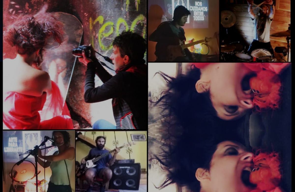 La acción comienza en un pasillo desvencijado, ambiente que sugiere deterioro urbano. Las imágenes de los tres músicos y de la flautista están en forma simultánea, superpuestas en cada uno de los vértices de la pantalla. Detrás de Marchetti, un cartel dice “Nos cuidamos entre todxs” y otro, proclama “Arte para liberarte”, a espaldas de Toledo. La sirena que suena antes de la música y los movimientos de la cámara, inducen una sensación de vértigo no muy agradable.