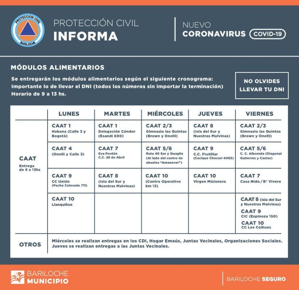 Juan Pablo Ferrari, secretario de Desarrollo Humano del Municipio, quiso enviar un mensaje a todas aquellas personas o familias que aún no están recibiendo ninguna clase de ayuda: “hay dos carriles, cuando son casos de emergencia como discapacidad, adultos mayores, madres que no pueden dejar a sus hijos solos por ejemplo, envían un mensaje por whatsApp al +54 9 294 463-9660”. La otra vía es por medio de los CAAT en cada uno de sus territorios (ver recuadro) o a través de los CDI.Al referirse a la articulación con la Red dijo “hace mucho tiempo que lo venimos haciendo pero de manera más informal”.