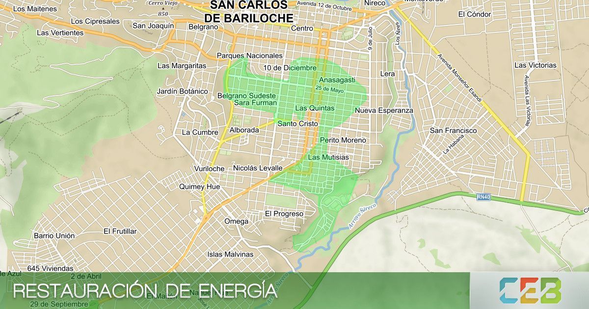 En diálogo con El Cordillerano Radio (93.7), el presidente de la CEB Carlos Aristegui, señaló que los motivos del corte “son fundamentalmente por el tema climático. Según los registros, a la tarde en la zona de Colonia Suiza y las Victorias tuvimos problemas de las ramas sobre las líneas. Después en la zona céntrica, a la madrugada.”