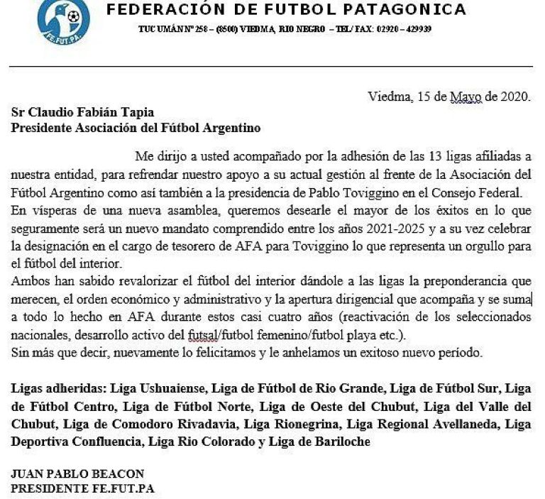 En ese sentido la Federación Patagónica de Fútbol a través de un comunicado manifestó que tanto Chiqui Tapia como Pablo Toviggino (ex Presidente del CF y ahora Tesorero) “han sabido revalorizar el fútbol del interior dándole a las Ligas la preponderancia que merecen, el orden económico y administrativo y la apertura dirigencial que acompaña y se suma a todo lo hecho en AFA durante estos casi cuatro años de mandato”.