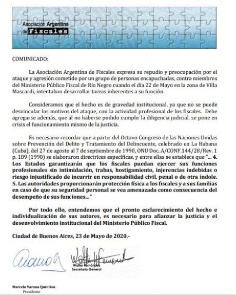 A través de un comunicado, la Asociación Argentina de Fiscales expresó su repudio y preocupación y señalaron al hecho como de "gravedad institucional" y que pone "en crisis el funcionamiento mismo de la Justicia".