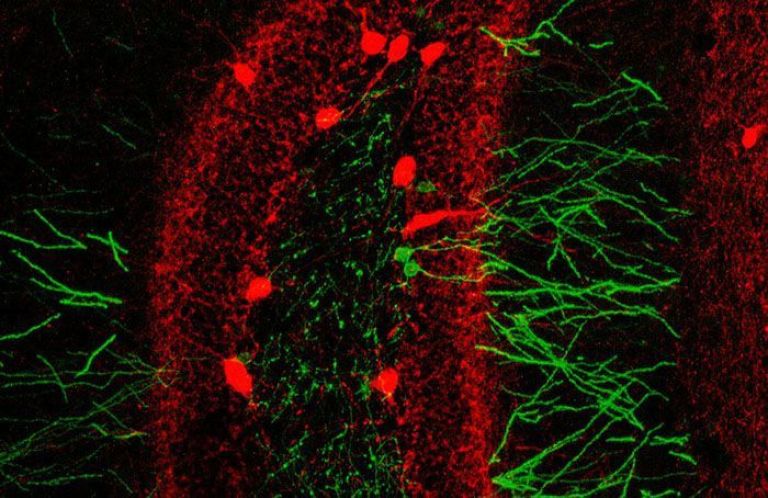 En animales de laboratorio, los científicos del Instituto Leloir comprobaron que los estímulos cognitivos y sensoriales aceleran la conexión de las neuronas nuevas (color verde), que participan en la memoria y el aprendizaje, con interneuronas (color rojo) encargadas de controlar la actividad de esa región del cerebro.