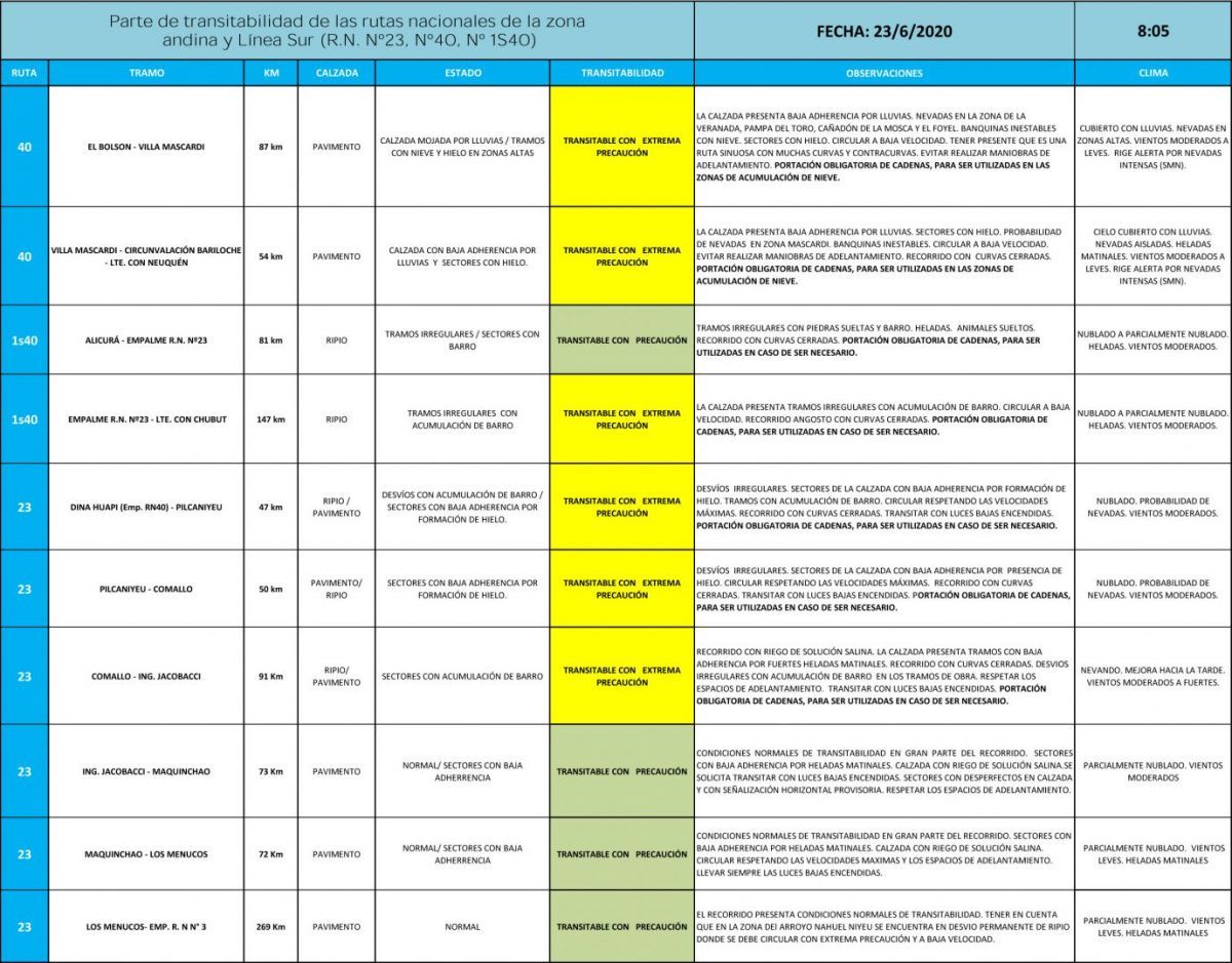 Por otra parte, en el parte matutino de hoy, desde vialidad Nacional informaron que el tramo entre El Bolsón y Villa Mascardi Ruta 40 se encuentra transitable con extrema precaución, debido a que hay tramos con baja adherencia por presencia de hielo. Piden no circular de noche y la calzada se encuentra mojada, con tramos con baja adherencia por formación de hielo en zonas altas.