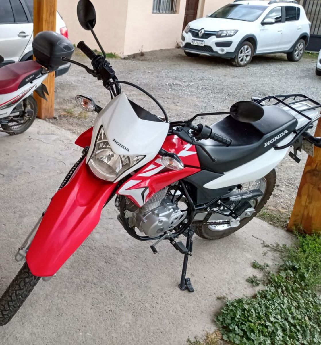 El vehículo es Honda XR 150 L., año 2019, patente A098MWF. Prensenta algunos rayones pequeños en el lado izquierdo, guiños, delatero y trasero, y espejo. Por una caída, está corrido el espejo y el embrague izquierdo hacia adentro, lo que deja un rayón en el manubrio.