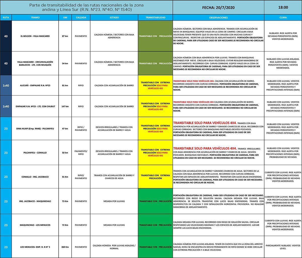 El 20° Distrito Río Negro de Vialidad Nacional, informa que la Ruta Nacional N°23, entre Comallo y Dina Huapi, se encuentra transitable solo para vehículos 4x4 debido a la presencia de tramos con baja adherencia por acumulación de barro y grandes charcos de agua. Se recomienda no circular en horario nocturno.