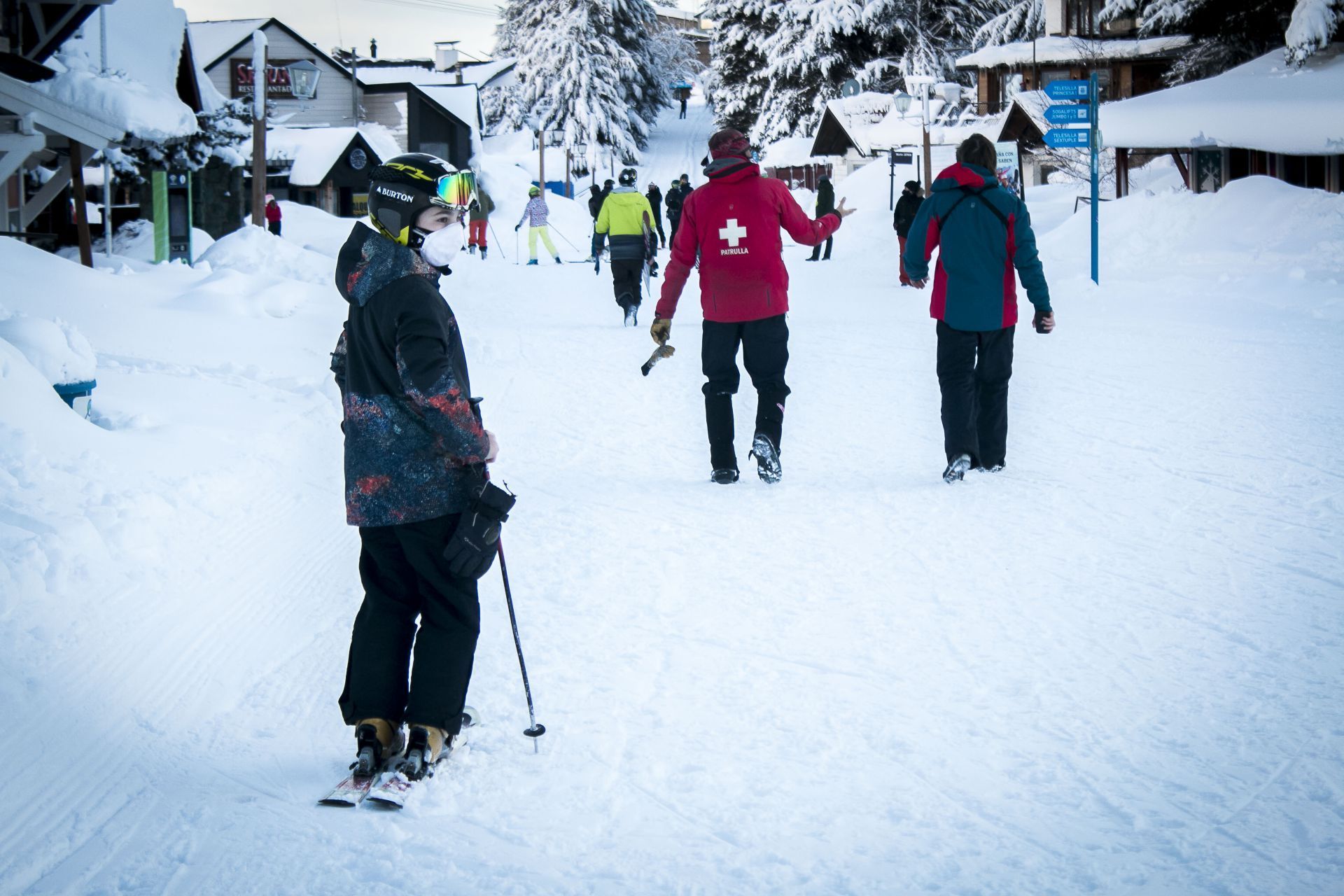 Una vez arriba, se observaba a integrantes de la Asociación Argentina de Instructores de Esquí, Snowboard y Pisteros Socorristas (AADIDESS) colaborar para que se cumplieran las normas. Por ejemplo, Tomás Olivieri, con el número 50 en su pechera, explicó: “Hace más de veintidós años que trabajo en el Catedral, siempre como profesor de esquí. Hoy, en una función distinta; no estamos dando clases. No hay escuelas ni clubes abiertos. Muchos de los instructores del cerro nos prestamos a este voluntariado, a tratar de ayudar a que los esquiadores mantengan la distancia y la disciplina, siempre con la intención de cuidar a la gente. Se nos asignó con la denominación de ‘preventores’. Queremos que todo funcione. Mantuvimos reuniones para coordinar los protocolos que determinaron la Provincia, Nación y la empresa. Son diez días, y, si todo sale bien, se continuará. Ojalá que, dentro de lo posible, en agosto haya algo más abierto a nivel comercial, que también se pueda dar alguna lección de esquí… Ahora es solo para los barilochenses. Las boleterías están cerradas, únicamente se puede utilizar el pase de residente. Es una prueba piloto. Nos tenemos que portar bien y ayudarnos entre todos para que siga abierto”.