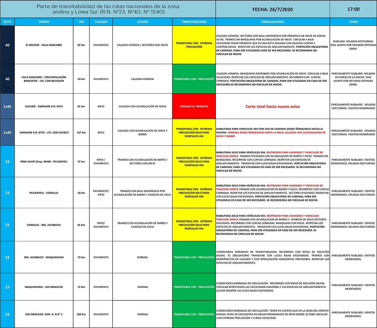 Según se informó en el parte de transitabilidad de Vialidad Nacional, la calzada -- presenta baja adherencia por formación de hielo y acumulación de nieve en zonas altas (Pampa del Toro, La Veranada y Cañadon de la Mosca). Equipos viales están trabajando en el despeje de la calzada. Hay tramos sin banquinas por acumulación de nieve. Por todo esto, es imprescindible circular a baja velocidad, tener presente que es una ruta sinuos con muchas curvas y contracurvas. Evitar realizar maniobras de adelantamiento. El uso de cadenas es obligatorio en zonas altas, el tramo se encuentra granceado con sal.