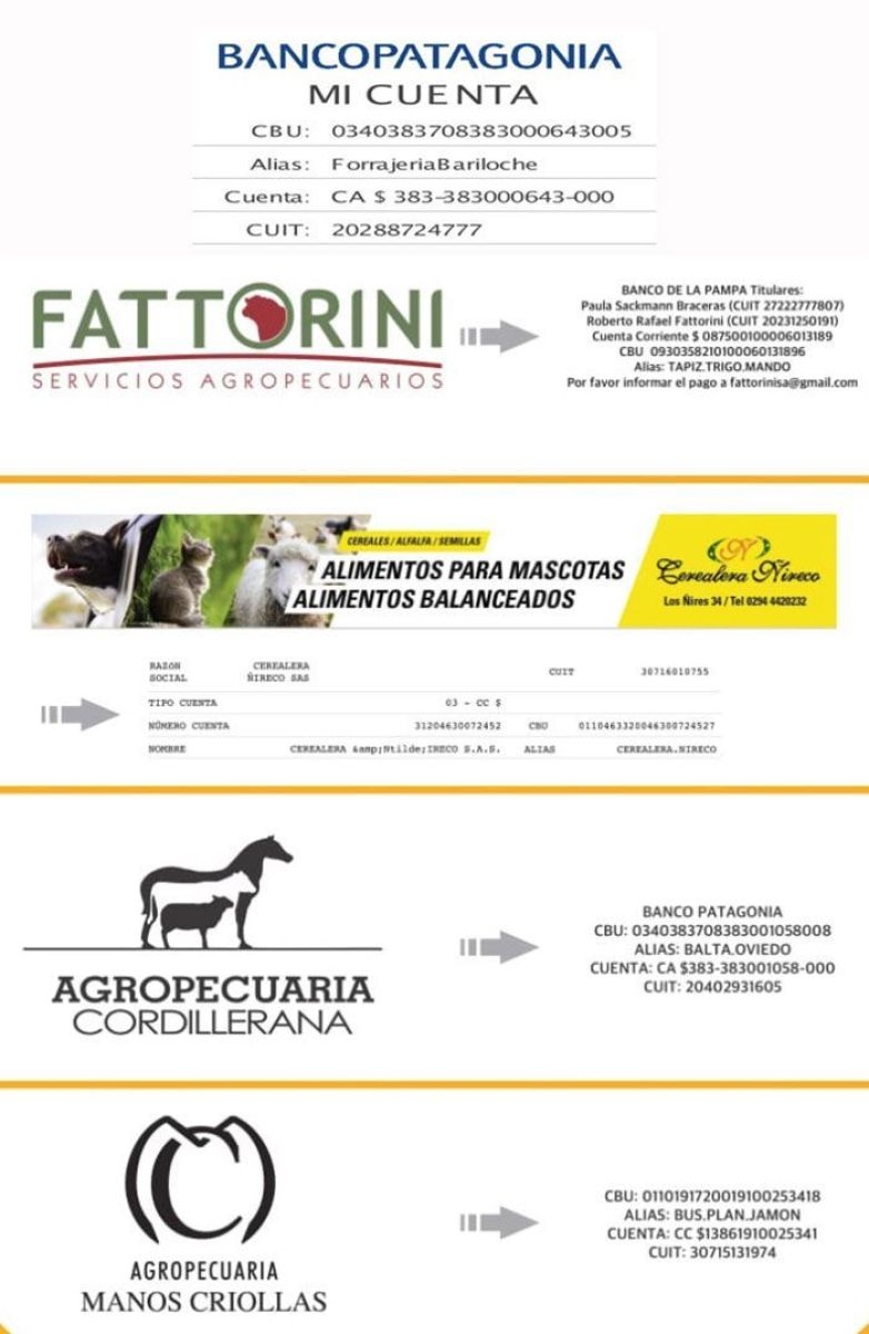 Los comercios adheridos son Fattorini Servicios Agropecuarios ( Luis Beltrán 215), Cerealera Ñireco (Los Ñires 34) , Agropecuaria Cordillerana (12 de Octubre 1599), Forrajería Bariloche (Ruta 40 y Chapel El Frutillar)  y  Agropecuaria Manos Criollas (Italia 316),  en las ilustraciones pueden ver los números de cuentas y CBU correspondientes.