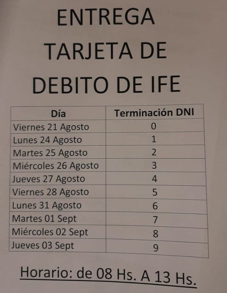 Este viernes 21 el Banco Nación  iniciará el reparto de las tarjetas de débito para beneficiarios del IFE (Ingreso Familiar de Emergencia) en el horario de 8 a 13 horas.