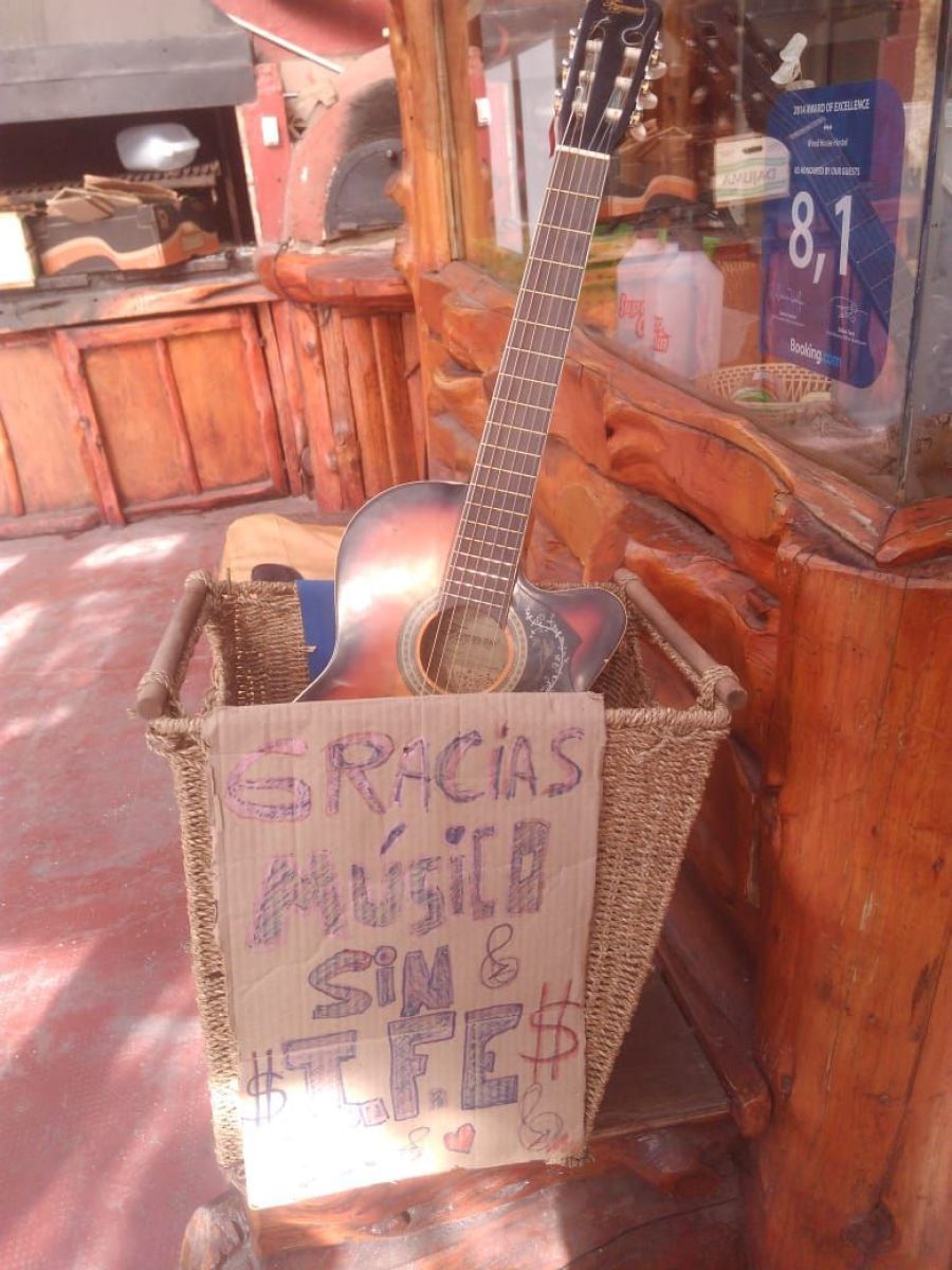 Los clientes del Banco Patagonia sucursal Gallardo quizá repararon en la música que ayudó a sobrellevar la espera en los últimos días. Allí se instala periódicamente Nano Martínez, habitual animador de la escena local, a quien la irrupción de la pandemia tomó en mal momento. El músico estaba en Perú cuando se cerraron fronteras y cancelaron vuelos. Su retorno fue una auténtica odisea en la que no faltaron algunos detalles un tanto macabros.