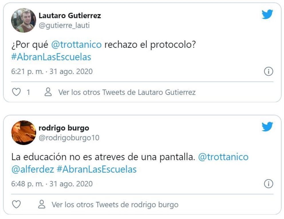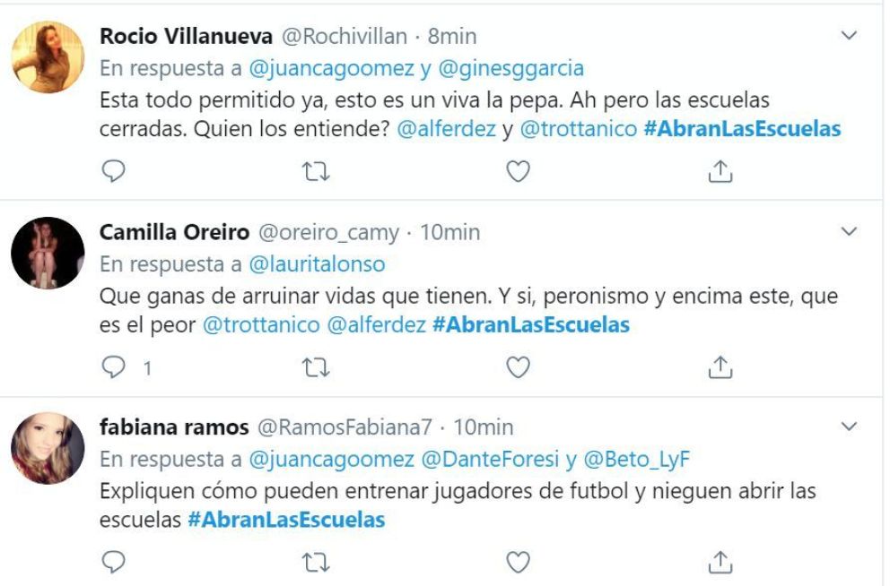 En Twitter comenzó a circular el hashtag #AbranLasEscuelas, usado para cuestionar la decisión del ministro y pedir la vuelta a clases de los chicos. Desde el periodista Gustavo Bazan hasta la ex titular de la oficina de anticorrupción, Laura Alonso reclamaron en las redes para que se abran las escuelas. La educación fue uno de los primeros ámbitos en entrar en cuarentena (el 16 de marzo), incluso antes de que se declarara el aislamiento social, preventivo y obligatorio el 20 de marzo.
