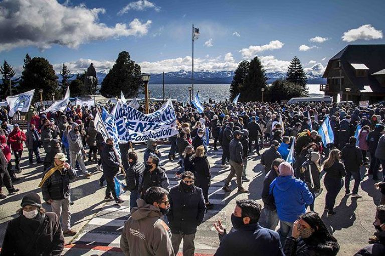 Bajo el lema “Turismo somos Todos” trabajadores y empresarios del sector volvieron a movilizarse. La población de Bariloche se mancomunó por el pedido de una reapertura turística en el Centro Cívico. Había sectores gremiales identificados con pancartas y pecheras, pero, también, en la concentración afloró el comerciante “común”, aquel que ve que lo trabajado toda una vida se derrumba en pocos meses.