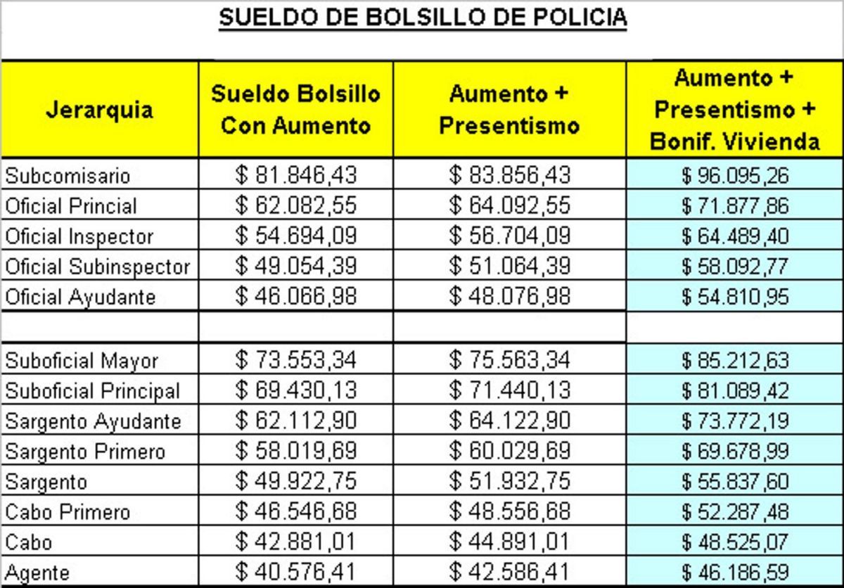 Cabe recordar que con el aumento otorgado por el Gobierno, un agente que recién se inicia pasará a cobrar con los salarios de septiembre $40.576,41 neto de bolsillo, y un oficial ayudante $42.586,41 neto de bolsillo, a lo que hay que sumarle las bonificaciones por Vivienda y Presentismo.