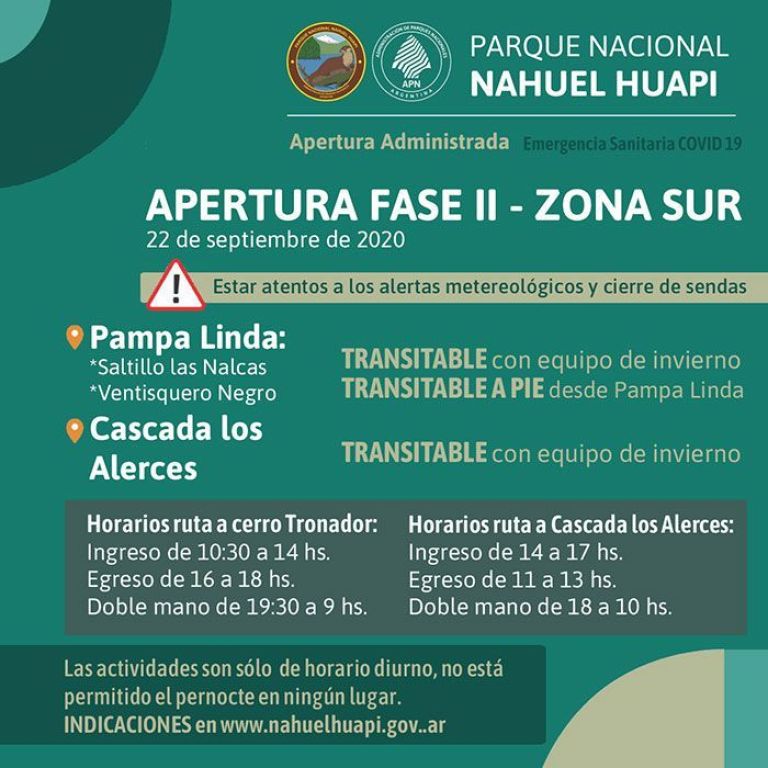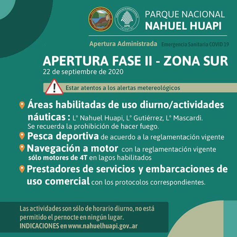 La Intendencia del Parque Nacional Nahuel Huapi informó que la Dirección de Operaciones de la Administración de Parques Nacionales aprobó el Plan de Reapertura Fase 2 etapa 1 de este Parque Nacional para la zona de la provincia de Río Negro, en concordancia con la normativa del gobierno provincial, y junto a las recomendaciones de los Ministerios de Salud Pública de Nación y Río Negro.