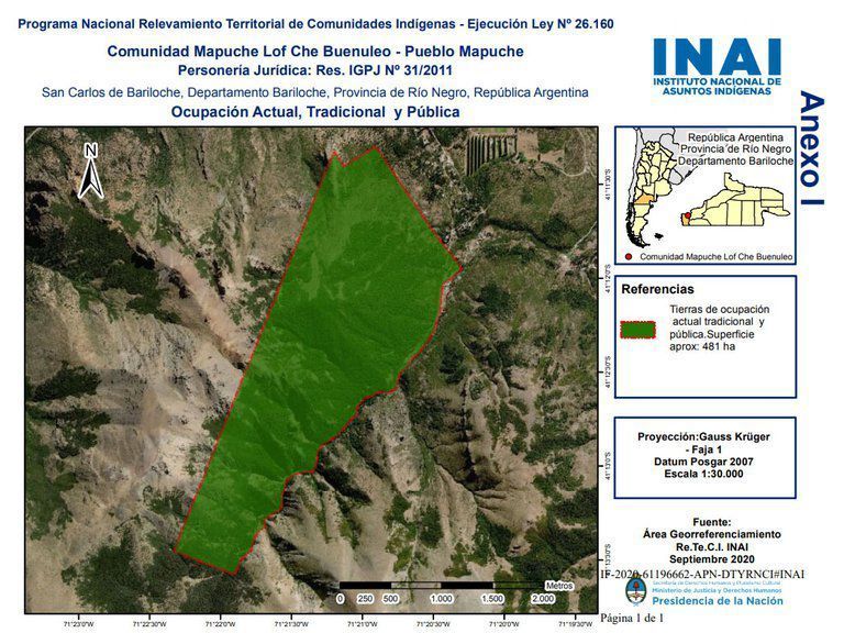 Este miércoles, el Instituto Nacional de Asuntos Indígenas (INAI) reconoció “la ocupación actual, tradicional y pública” de la comunidad Lof Che Buenuleo" en un predio de 481 hectáreas de Bariloche.