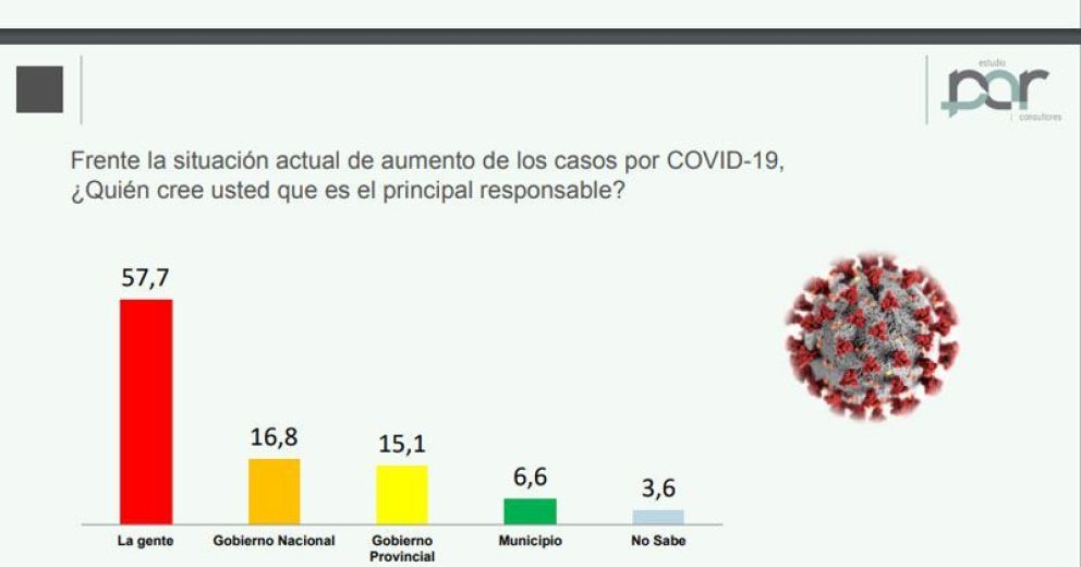 Según los datos publicada por la consultora, el 57,7 de la población considera que “el aumento de los casos por COVID-19” son responsabilidad de 2la gente”. La consulta apunta al período de incremento de los casos en la provincia, registrado en diferentes ciudades durante septiembre, incluida Bariloche.