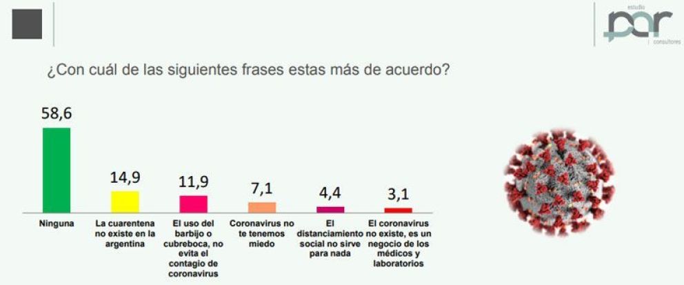 Al respecto, 58% de los encuestados sostuvo que no acuerda con los supuestos que aseguran que “el coronavirus no existe”. La misma población tampoco abala que el virus sea “un negocio creado por los laboratorios y médicos” ni con el desaliento del uso de tapabocas y el respeto del distanciamiento social como medidas preventivas.