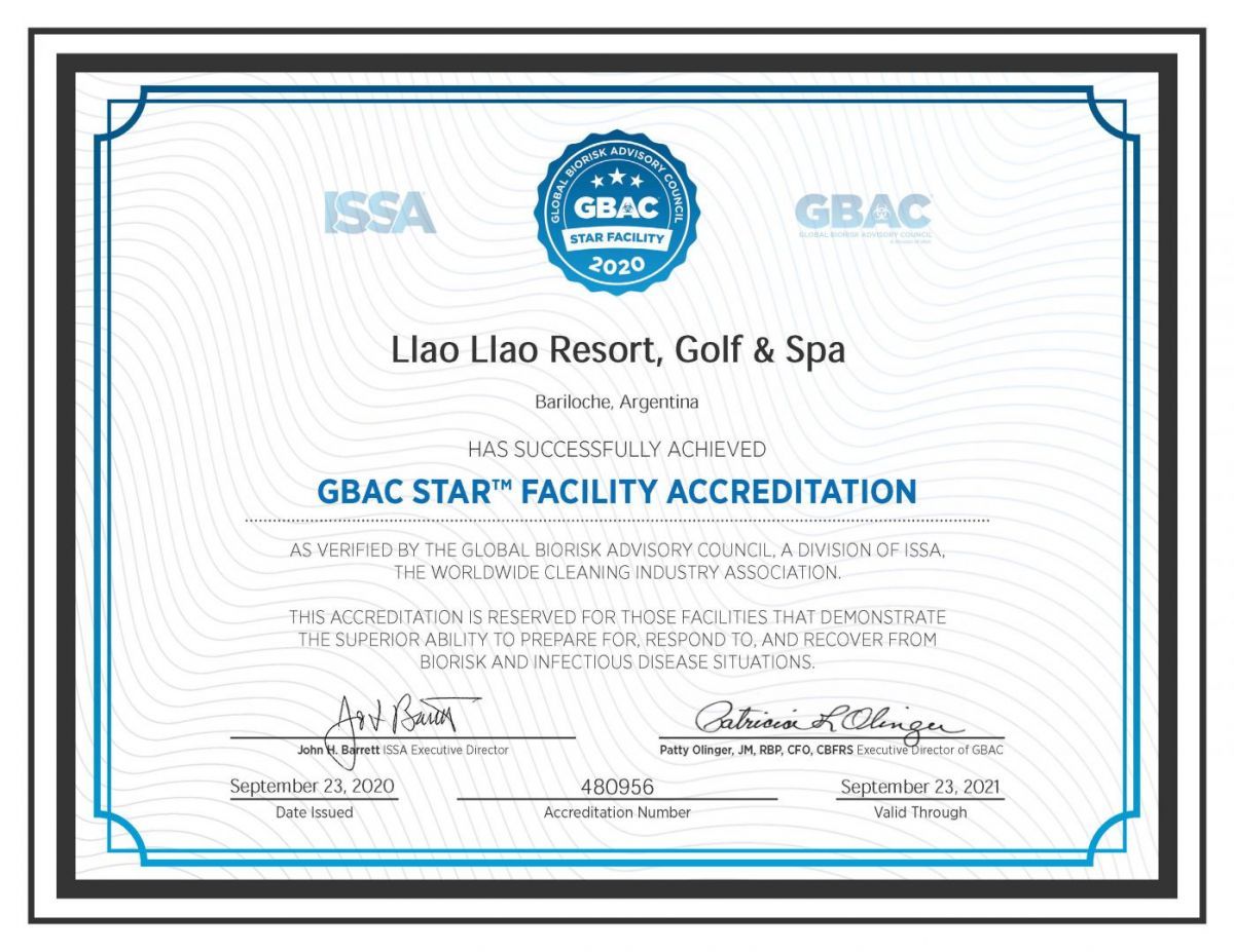 Llao Llao Resort, Golf & Spa, miembro de The Leading Hotels of the World, anunció que con fecha 23 de septiembre del corriente se le ha otorgado la reconocida certificación internacional GBAC STAR™, y de esta manera se convierte en el primer resort en el país en haberla obtenido.