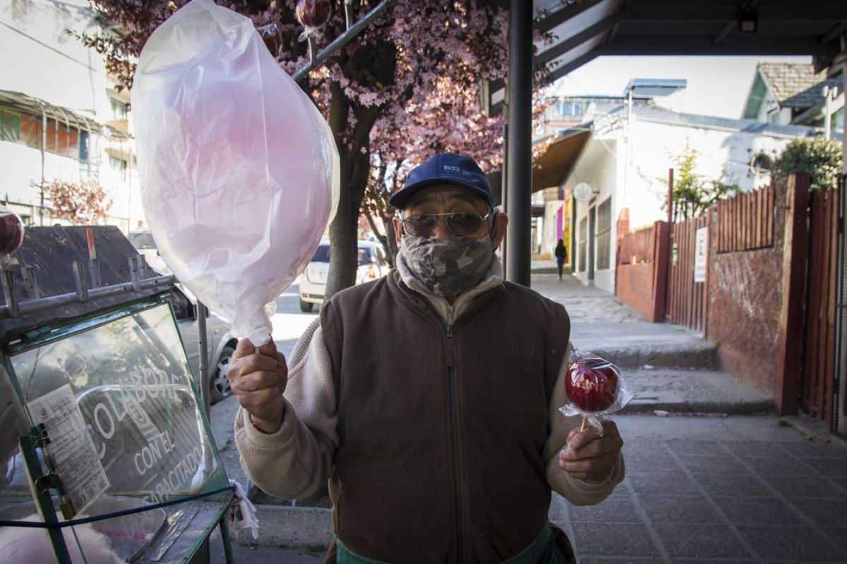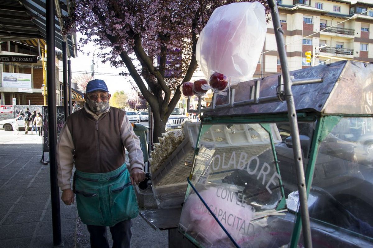 Manzanas caramelizadas, algodón de azúcar, garrapiñadas y los pochoclos más ricos de Bariloche son elaborados muy tempranito por Ernesto Williams y ofrecidos a la venta por él mismo después de cada mediodía.