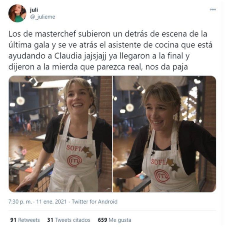 "Los de MasterChef subieron un detrás de escena de la última gala y se ve atrás el asistente de cocina que está ayudando a Claudia, jajaja. Ya llegaron a la final y dijeron: ‘A la mie... que parezca real", escribió @_julieme en la red social.