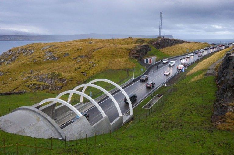 La “rotonda-medusa” se encuentra al final del túnel Eysturoy y se espera que además de ayudar a acortar tiempos y distancias, la construcción ayude a fomentar el turismo tras la pandemia.
