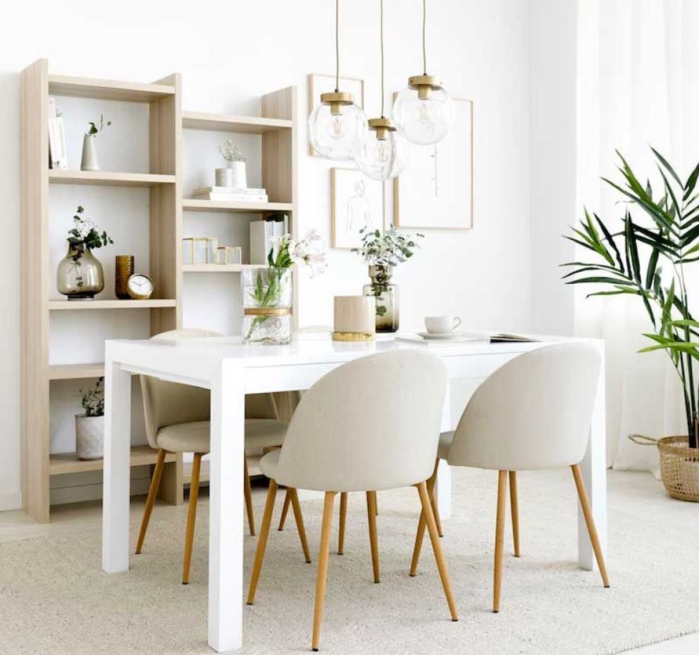 Puedes jugar y combinar el blanco de las paredes con un mobiliario en madera, un suelo de parqué con los muebles principales blancos o elegir piezas, como un escritorio, un aparador o una mesa de comedor (la Tulip es todo un clásico en este estilo) en esta combinación, que aporte un toque de carácter al ambiente y logre crear esa sensación, sin necesidad de cambiar toda la decoración de la estancia.