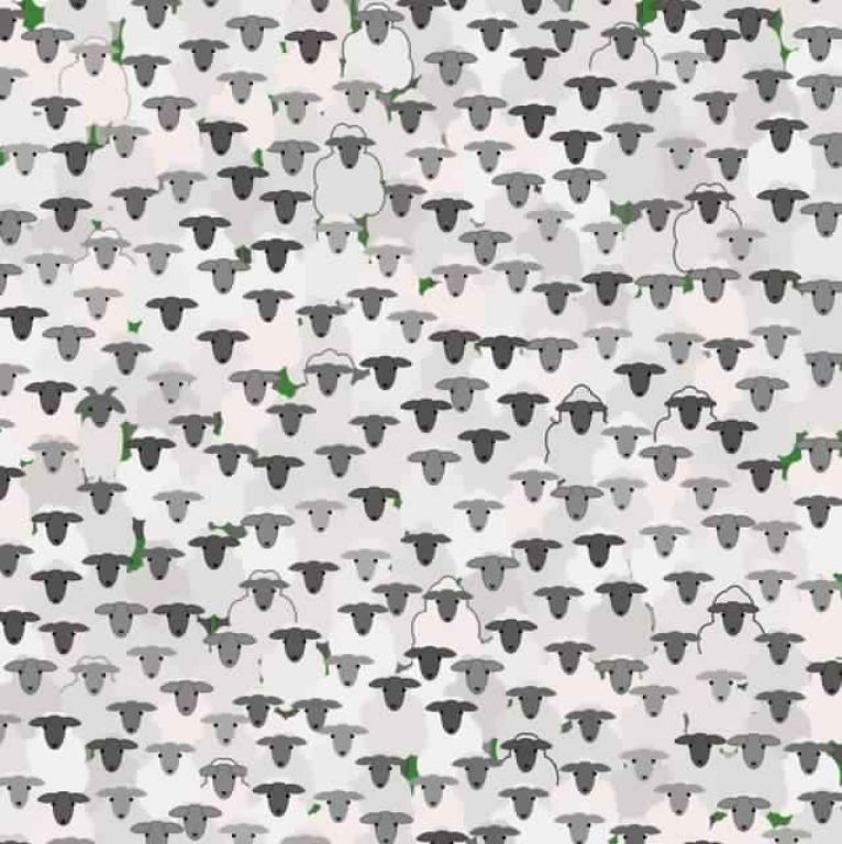 La imagen es simple. Hay un fondo blanco en donde aparecen un gran cantidad de caras de ovejas en diferentes tonos de grises y tienen algunas manchas verdes. En esta simple imagen, se debe encontrar a la cabra que se esconde entre todas las ovejas.