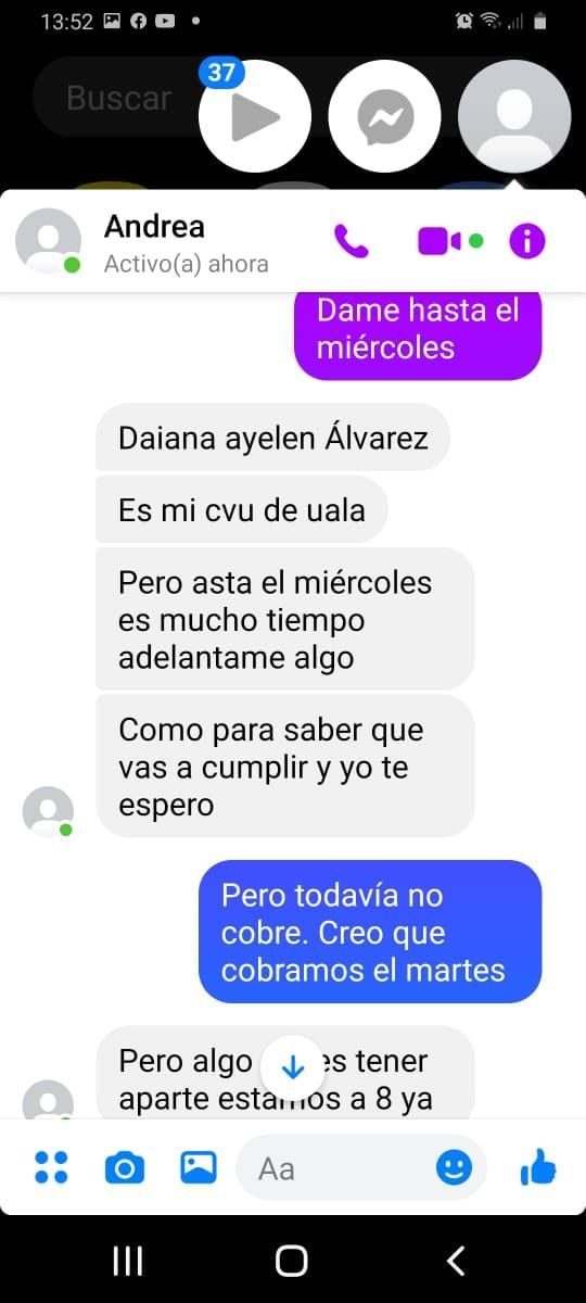 La mujer, cuando envió el número de CBU reveló otro nombre que no es el del perfil de Facebook, "Daiana Ayelén Alvarez".