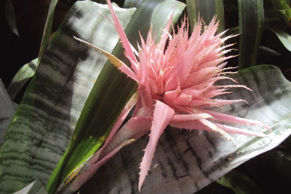 Bromelias: cultivadas en interiores prefieren los ambientes húmedos y cálidos. Crecen desde una roseta de hojas de tonos variables según el cultivar, con bandas plateadas, rosadas, variegadas, oscuras. Florecen una sola vez; luego la planta muere pero deja en la base numerosos retoños que permiten multiplicarla.