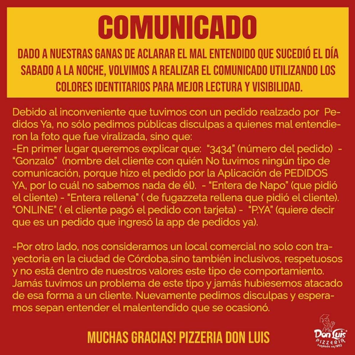 Todo comenzó el fin de semana cuando un joven de nombre Gonzalo pidió un delivery en la Pizzería Don Luis en Córdoba.