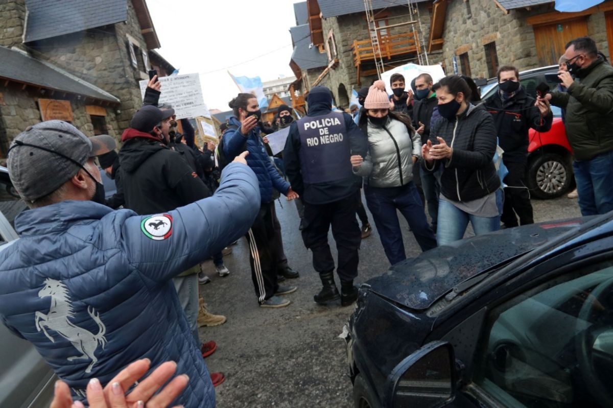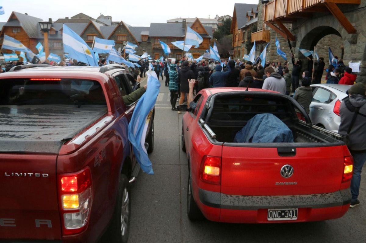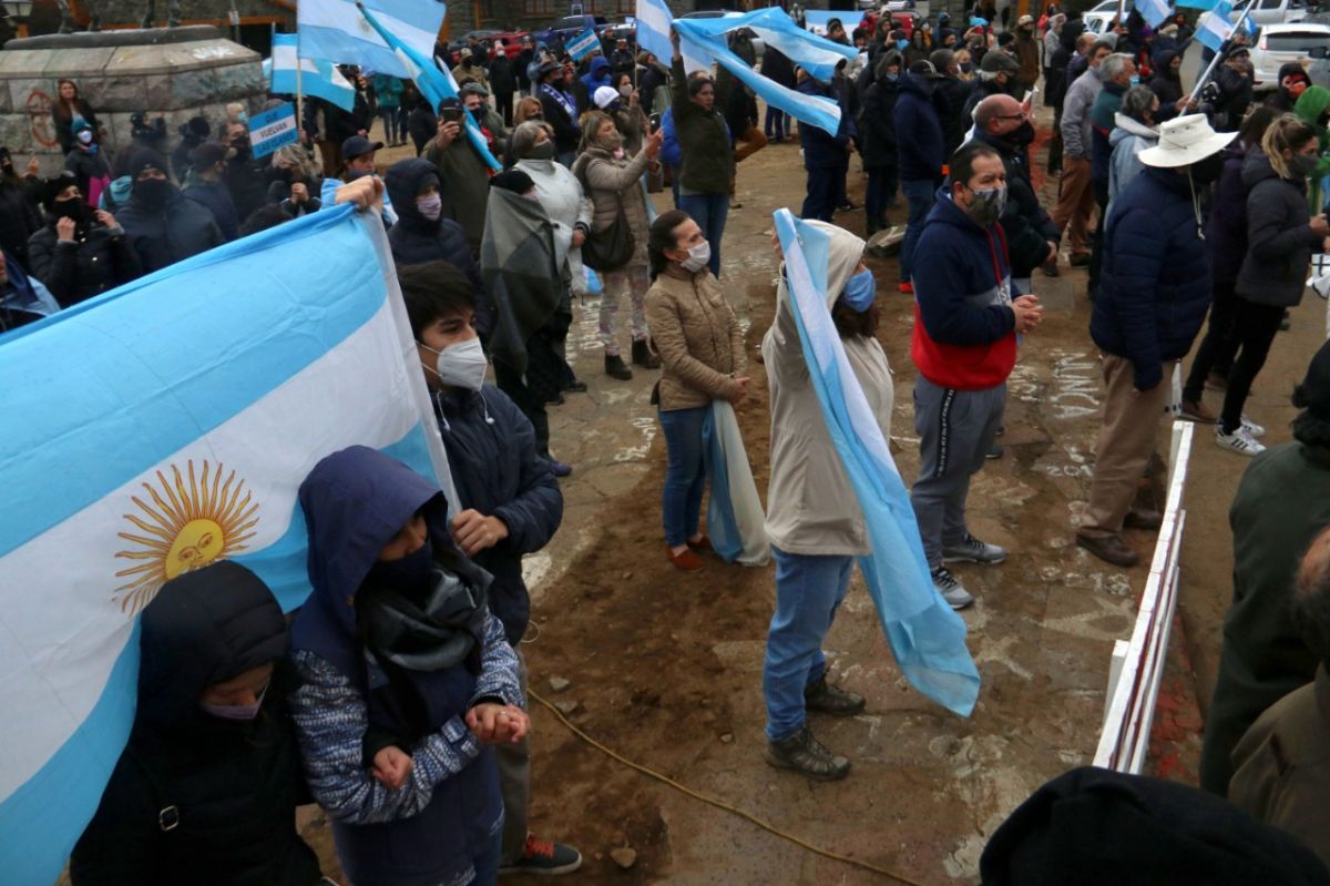 Entre quienes se concentraron, había representantes de partidos políticos, comerciantes, skaters, referentes antivacunas, vecinos de Villa Mascardi, gente que clamaba por la vuelta a clases, y hasta un “arbolito” al que se suele ver habitualmente ofreciendo cambio monetario en la calle Mitre.