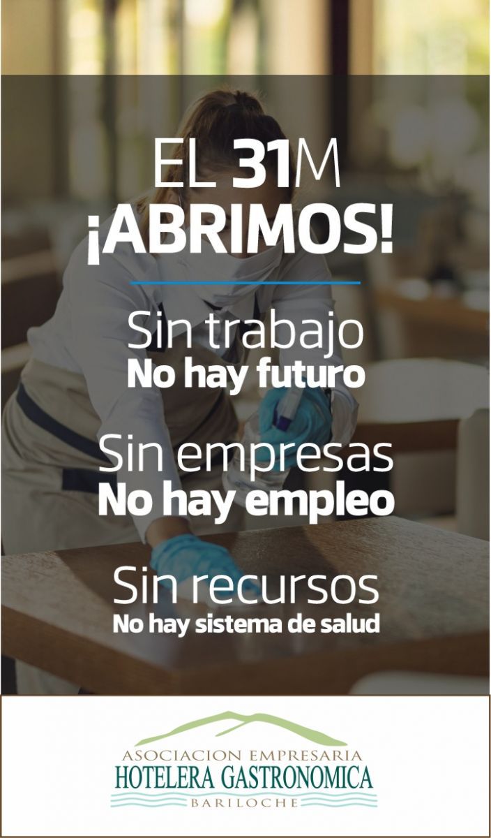 La Asociación Empresaria Hotelera Gastronómica de Bariloche (AEHGB) se suma a la demanda nacional “Abrimos el 31M a las 9” impulsada por diferentes instituciones del país vinculadas a la actividad turística. “Sin trabajo no hay futuro para ningún país. Sin empresas no hay empleo. Sin producción no hay sistema de salud sostenible”, promueve el lema de la acción federal.