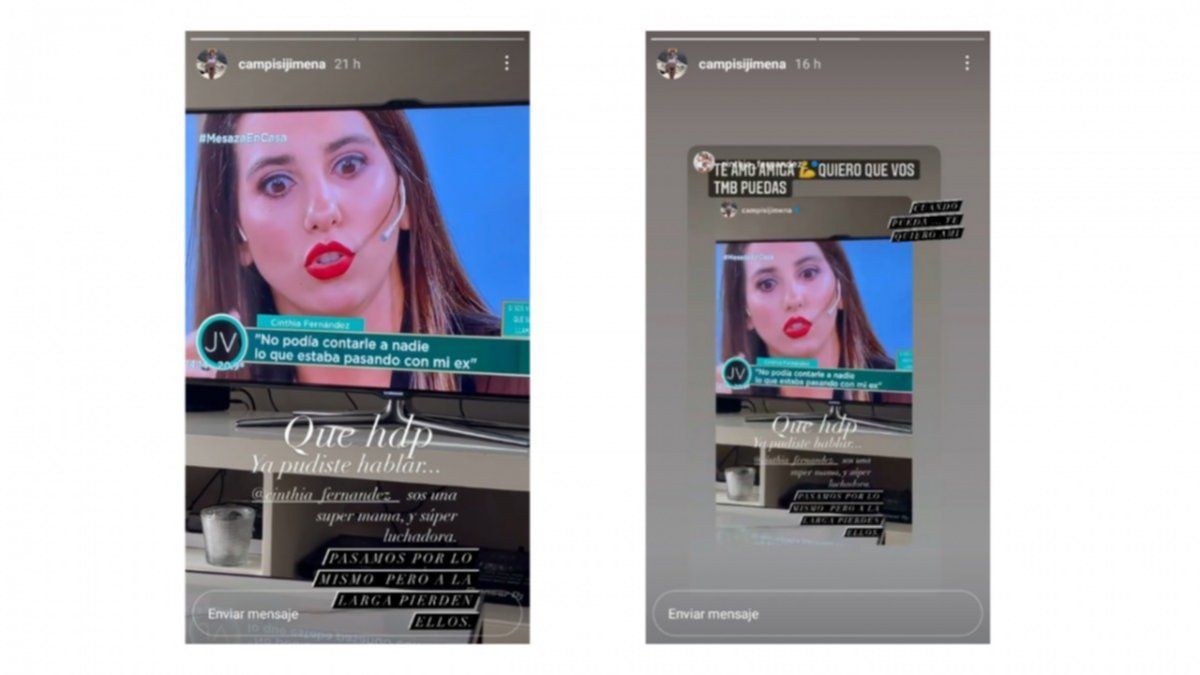 En la historia que compartió Jimena Campisi, la modelo expresó en su mensaje: "Qué hdp, ya pudiste hablar @cinthia_fernandez_ sos una súper mamá y super luchadora".