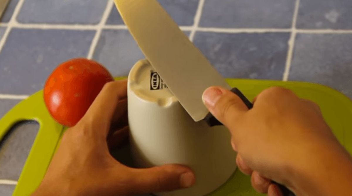 Una taza de cerámica será tu mejor aliado si de sacarle filo a tus cuchillos se trata. Necesitás que sea específicamente de cerámica, y que tengan el borde inferior crudo, es decir que no esté barnizado o esmaltado. Para usar la taza como afilador volteala y utilizá el canto del borde para afilar tu cuchillo como harías con una piedra, deslizando el borde inclinando el cuchillo a 45° grados aproximadamente y siempre por ambos lados del filo.