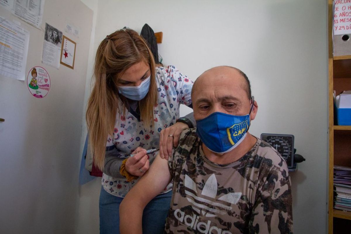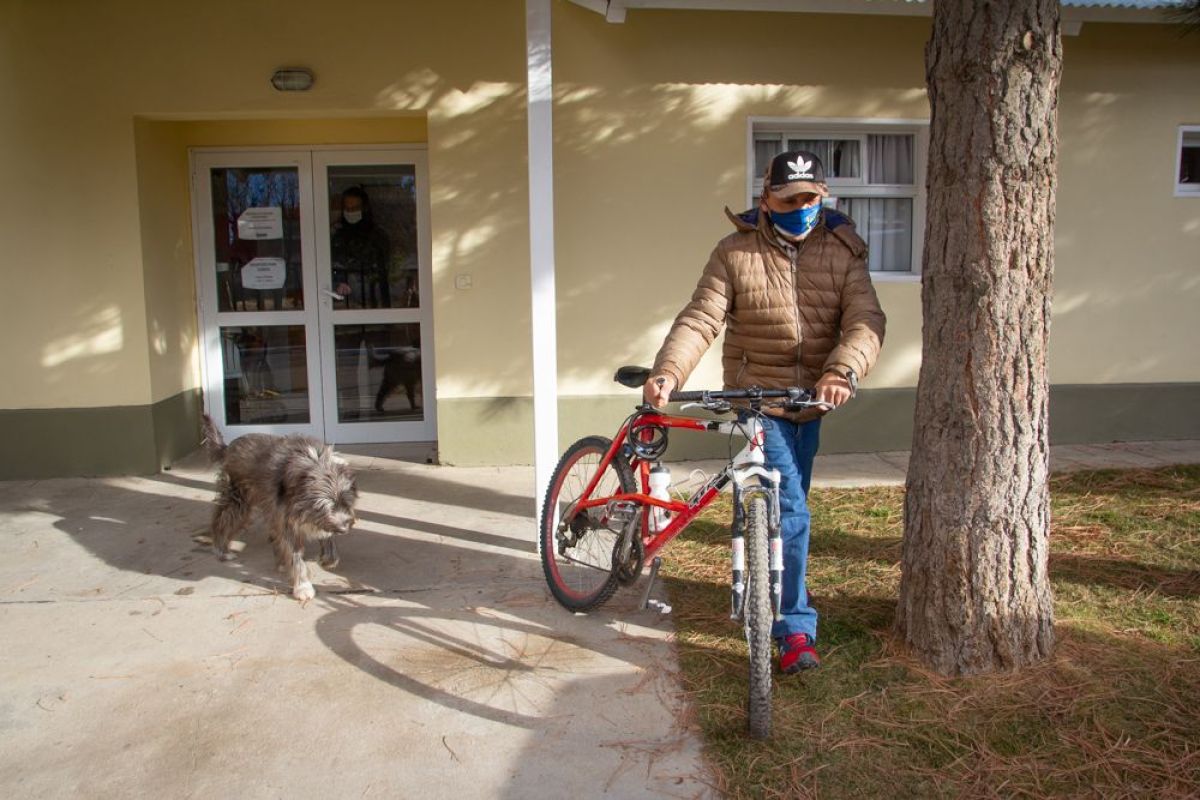 “Tenía ganas de vacunarme”, dice Jorge Arriagada, antes de marcharse del hospital de Pilcaniyeu en bicicleta, tras darse la primera dosis contra el COVID-19.