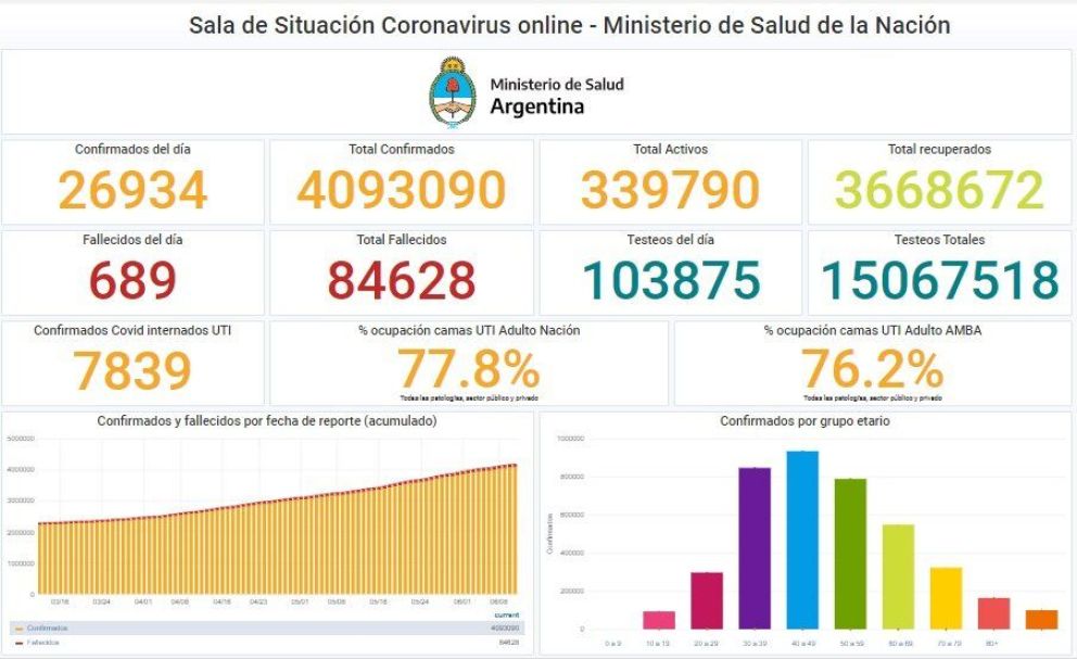 El Ministerio de Salud de la Nación informó que se registraron 689 personas fallecidas y 26.934 nuevos contagios en las últimas 24 horas en el país.