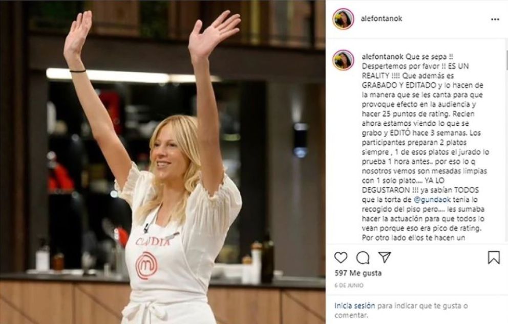 "¡Que se sepa! ¡Despertemos por favor! ¡Es un reality que además es grabado y editado, y lo hacen de la manera que se les canta para que provoque efecto en la audiencia y hacer 25 puntos de rating!", comenzó el mensaje de la también actriz en su cuenta de Instagram, publicado el 6 de junio, un día después de que su hermana pidiera disculpas en MasterChef Celebrity por levantar un toffe del piso y colocarlo en el plato que más tarde probaron los jurados.