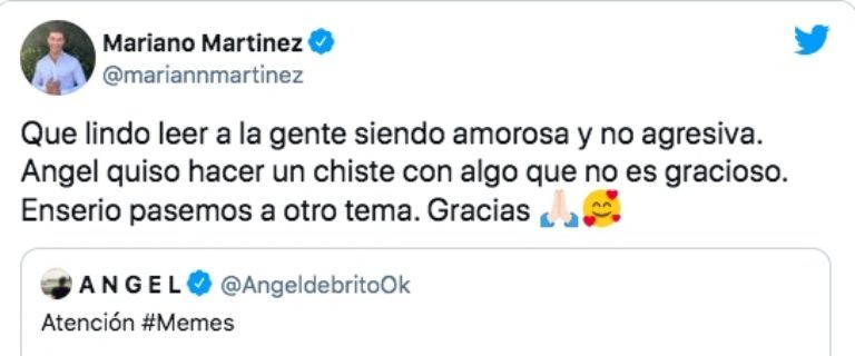 A Martínez no le gustó para nada el chiste, y salió a responderle sin pelos en la lengua: "Qué lindo leer a la gente siendo amorosa y no agresiva. Ángel quiso hacer un chiste con algo que no es gracioso. En serio pasemos a otro tema. Gracias".