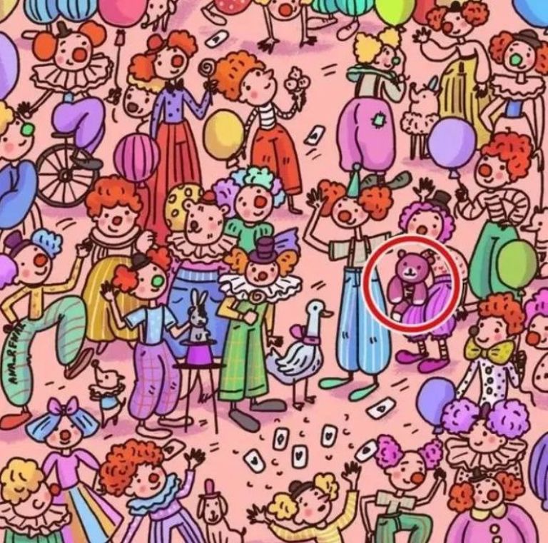 El reto de hoy consta de encontrar a un oso de peluche que está camuflado entre todos los payasos. Para ello, hay que mirar con detenimiento cada mínimo detalle de la ilustración, porque el peluche se ha camuflado muy bien.