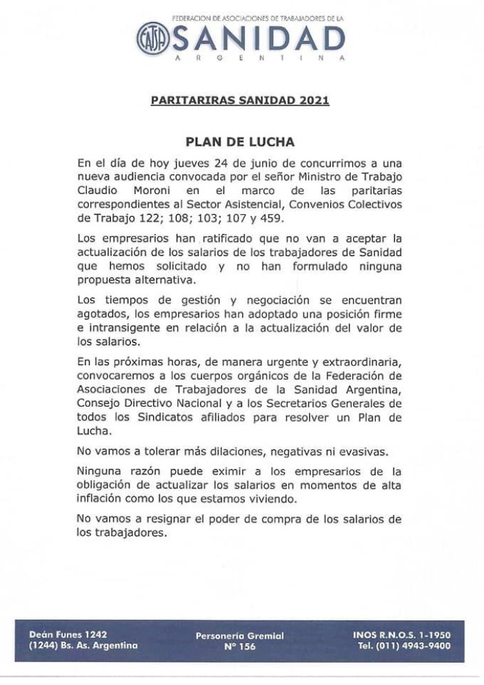 Desde el gremio compartieron el comunicado oficial del estado de negociación paritaria 2021, tras la Audiencia de este jueves en el Ministerio de Trabajo.