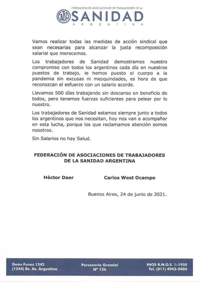 Según informaron desde el gremio, los trabajadores exigen una recomposición salarial justa para todo el Sector Asistencial. “Llevaremos adelante las acciones sindicales necesarias para lograr nuestros objetivos”, afirmaron. Y agregaron: “La unidad es nuestra mayor fortaleza compañerxs. Hoy y siempre”.