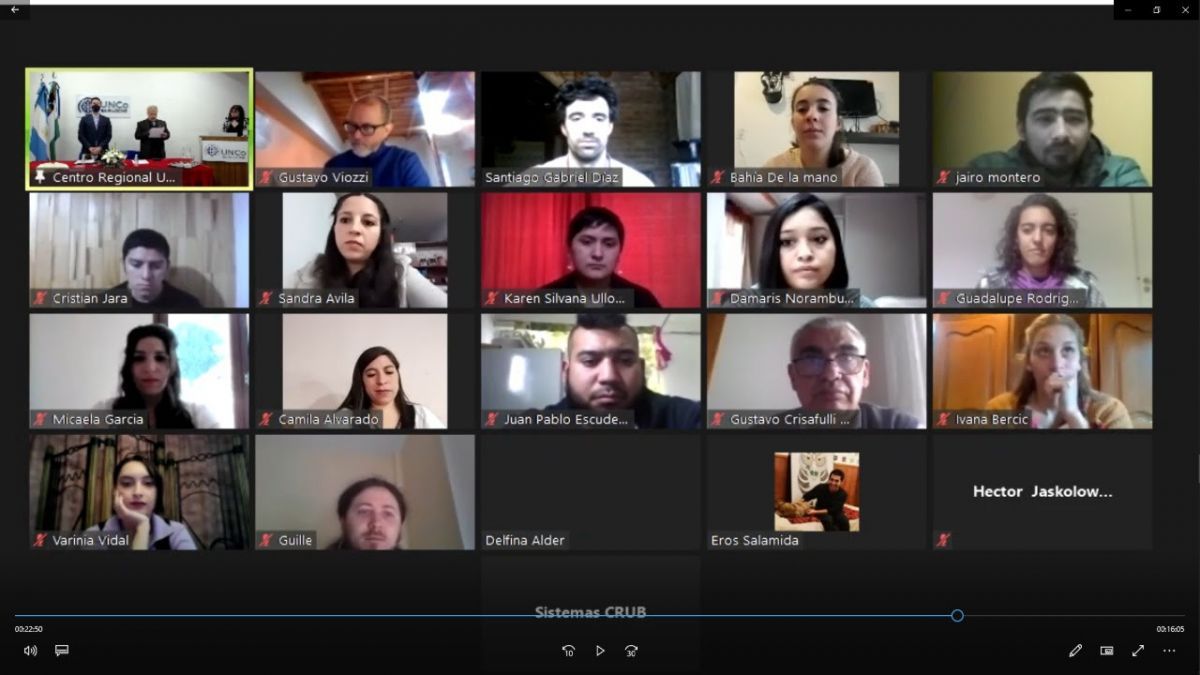 El encuentro virtual fue presidido por el rector de la Universidad Nacional del Comahue, Gustavo Crisafulli, y las autoridades de la UNCo Bariloche, decano Marcelo Alonso, y el secretario académico, Alfonso Aguilar. Tomó el rol de presentadora, la secretaria de Investigación, Mónica Palacio. El evento de transmisión se realizó desde la Sala De Haro de la UNCO Bariloche, mientras que egresados/as y participantes lo hicieron desde sus casas.