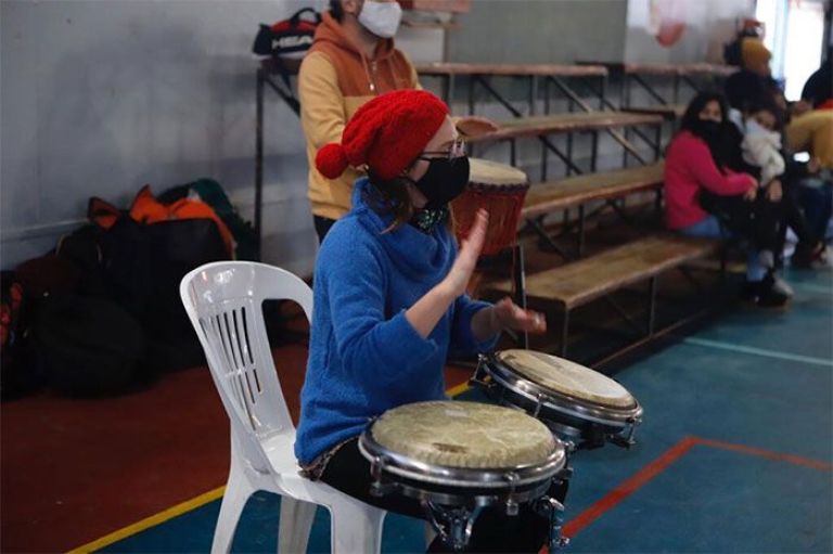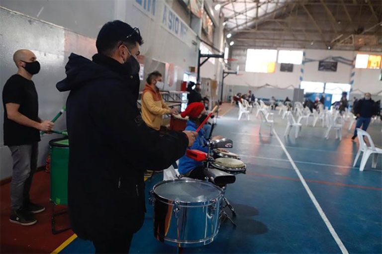 El grupo barilochense “La Banda Rodante” hace percusión con señas y realizaron una intervención artística en el vacunatorio, ubicado en el Gimnasio Municipal N°1 -Elflein y Ruiz Moreno- para acompañar a quienes se están yendo a vacunar.