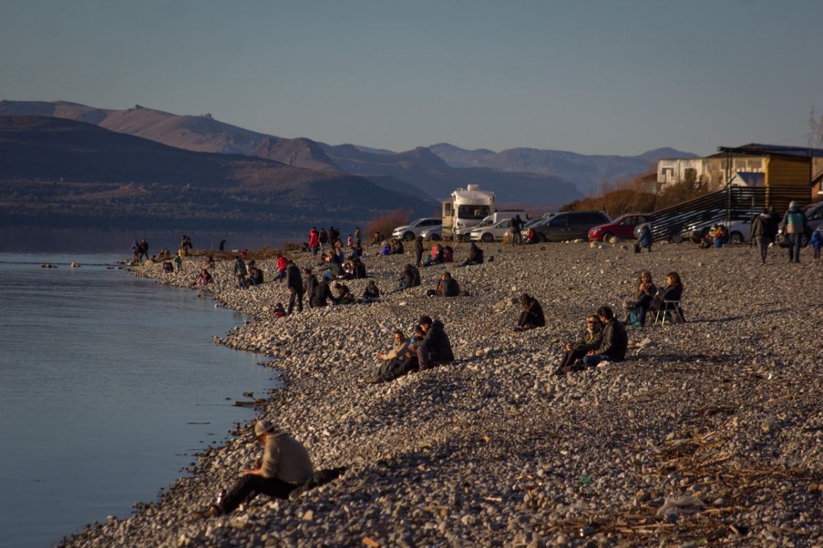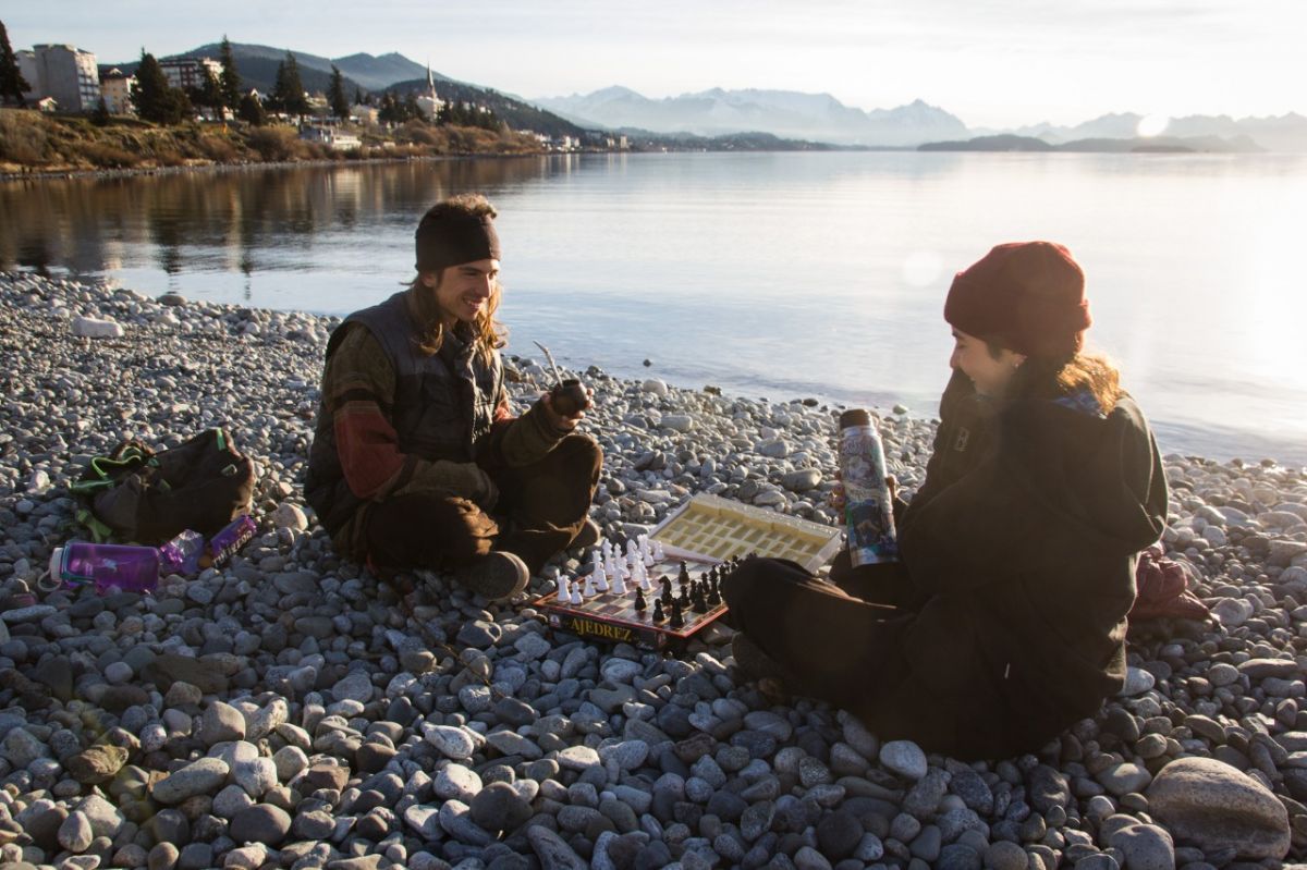 Muchos aprovecharon para pasar un rato en la costa, ya sea tomando mate o, como estos jóvenes, jugando una partida de ajedrez.