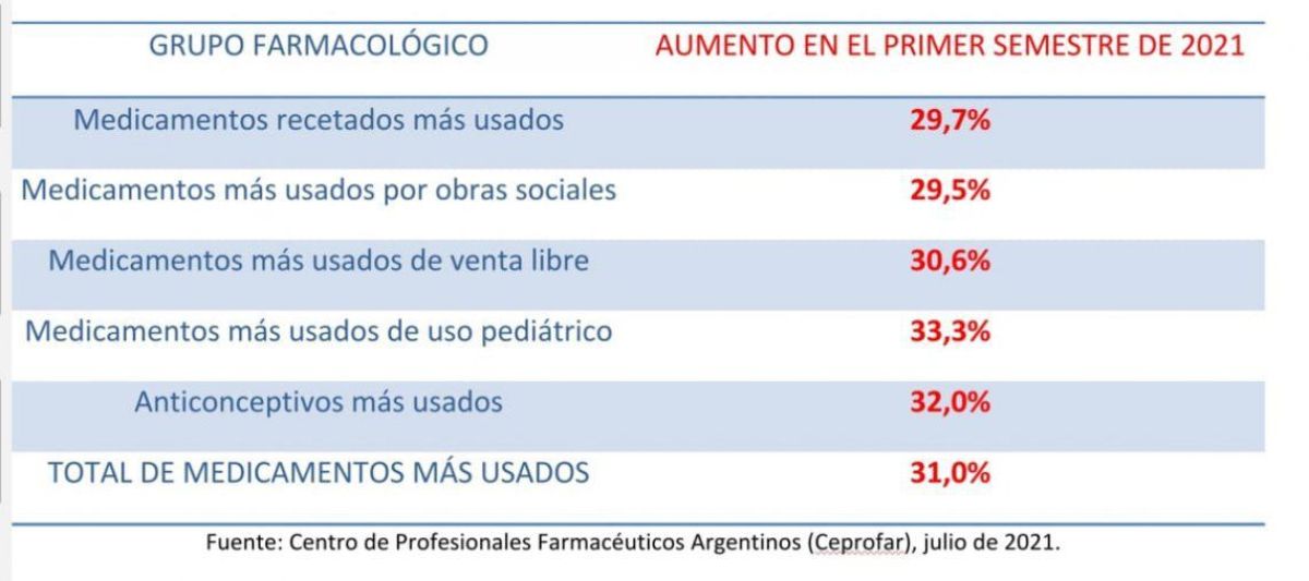 "Durante el primer semestre de 2021 los medicamentos más usados aumentaron en promedio un 31%, mientras que la inflación general (IPC) en el mismo período fue del 25,3%. El aumento por sobre la inflación es el 5,7%", indicó el trabajo de Ceprofar distribuido el sábado.