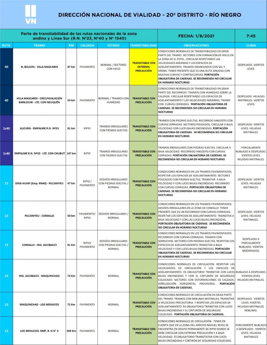 Si bien en el reporte del estado de rutas de este domingo por la mañana se indica que la transitabilidad en gran parte del tramo que une a Bariloche con El Bolsón es normal, pidieron circular con extrema  precaución en la zona de El Foyel por sectores con formación de hielo.