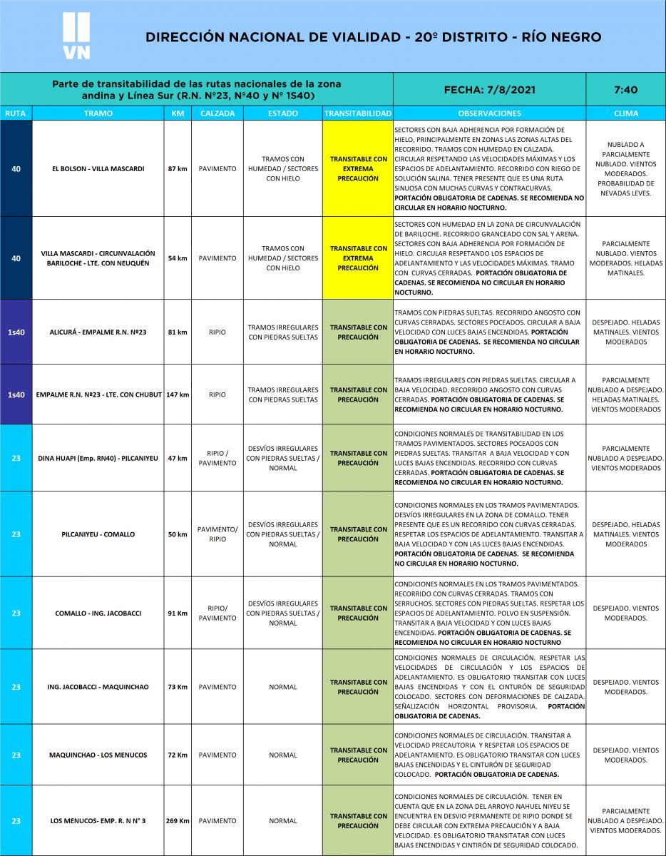 Mediante el reporte difundido temprano por la mañana desde Vialidad Nacional, informaron que cerca de las diez de la mañana se encontraba neviscando en las zonas altas de Ruta 40 Sur, precisamente en el tramo que une las ciudades de Bariloche y El Bolsón.